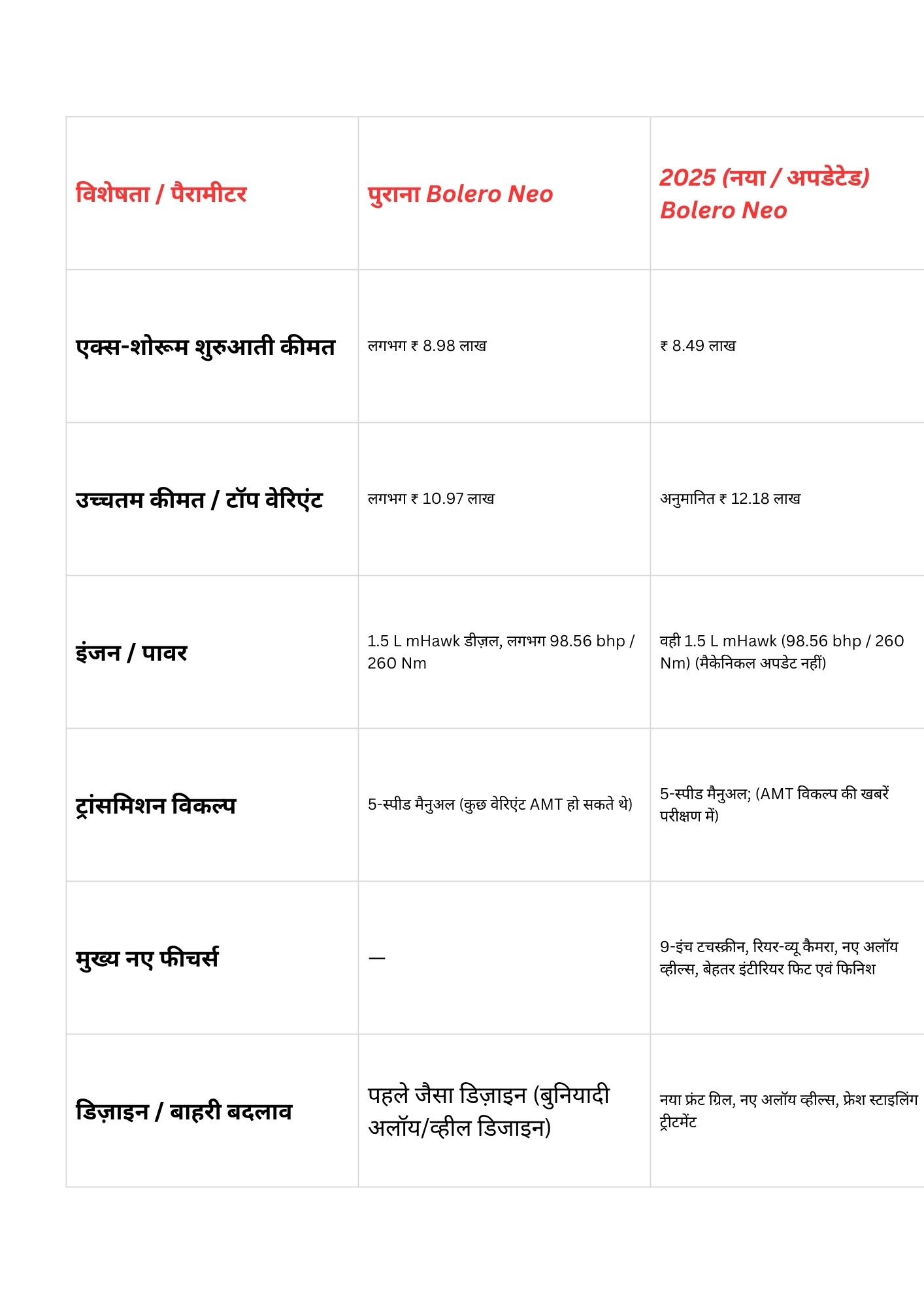 महिंद्रा का यह अपडेट इस SUV को मिड-साइज सेगमेंट में और भी प्रतिस्पर्धी बनाता है। जो ग्राहक एक मजबूत, स्टाइलिश और आधुनिक SUV की तलाश में हैं, उनके लिए Mahindra Bolero Neo 2025 अब एक बेहतरीन विकल्प साबित हो सकती है।